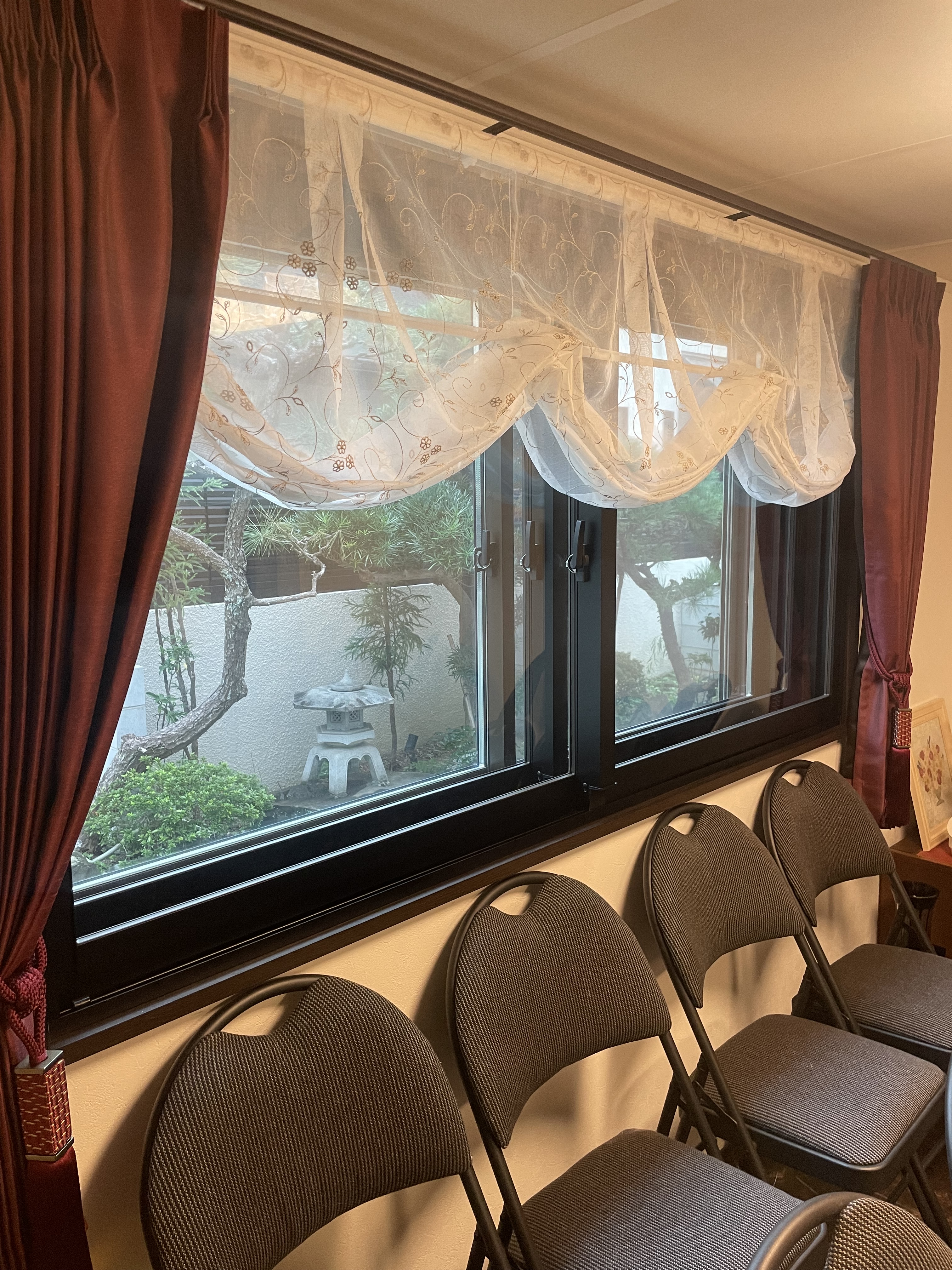 防音サッシに取り付けられた美しいドレープカーテンが高級感のある欧風なデザインでオーナー様のセンスの良さが感じられますね
