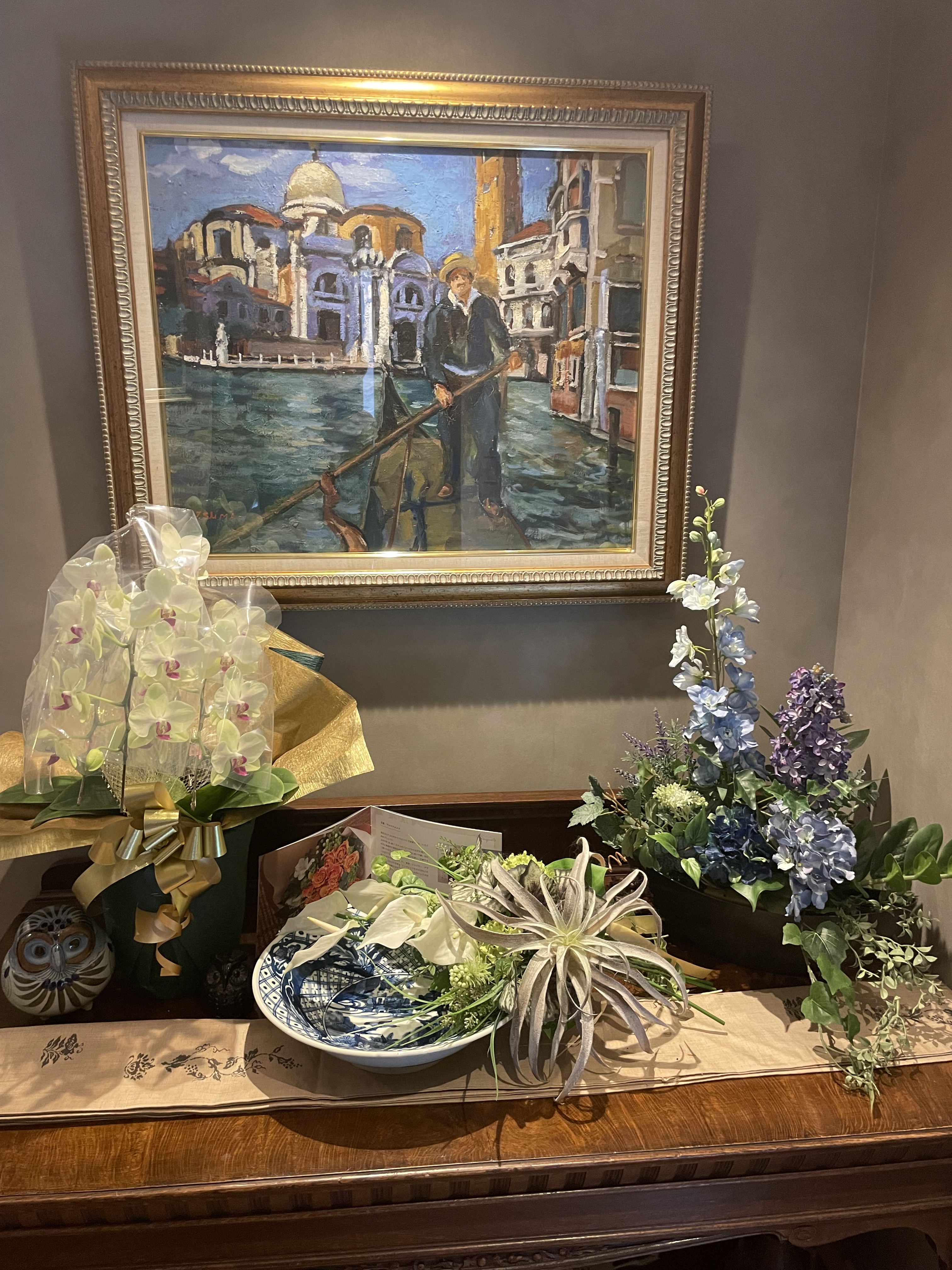そして防音室の扉を開けると玄関ホールには絵画と綺麗なお花が飾られています。他にも数点の絵画がありちょっとした美術館の雰囲気です