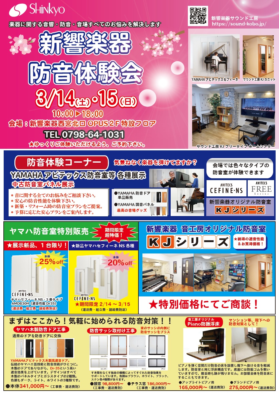 春の防音体験会3月14・15日開催! 2026年2月13日 最終更新日時 : 2026年2月13日 前垣スタッフ ★毎回好評いただいております防音体験会の開催が決まりました! 今回もお買い得盛りだくさんで皆様のご来場をお待ちしております。 →お申し込みはこちら